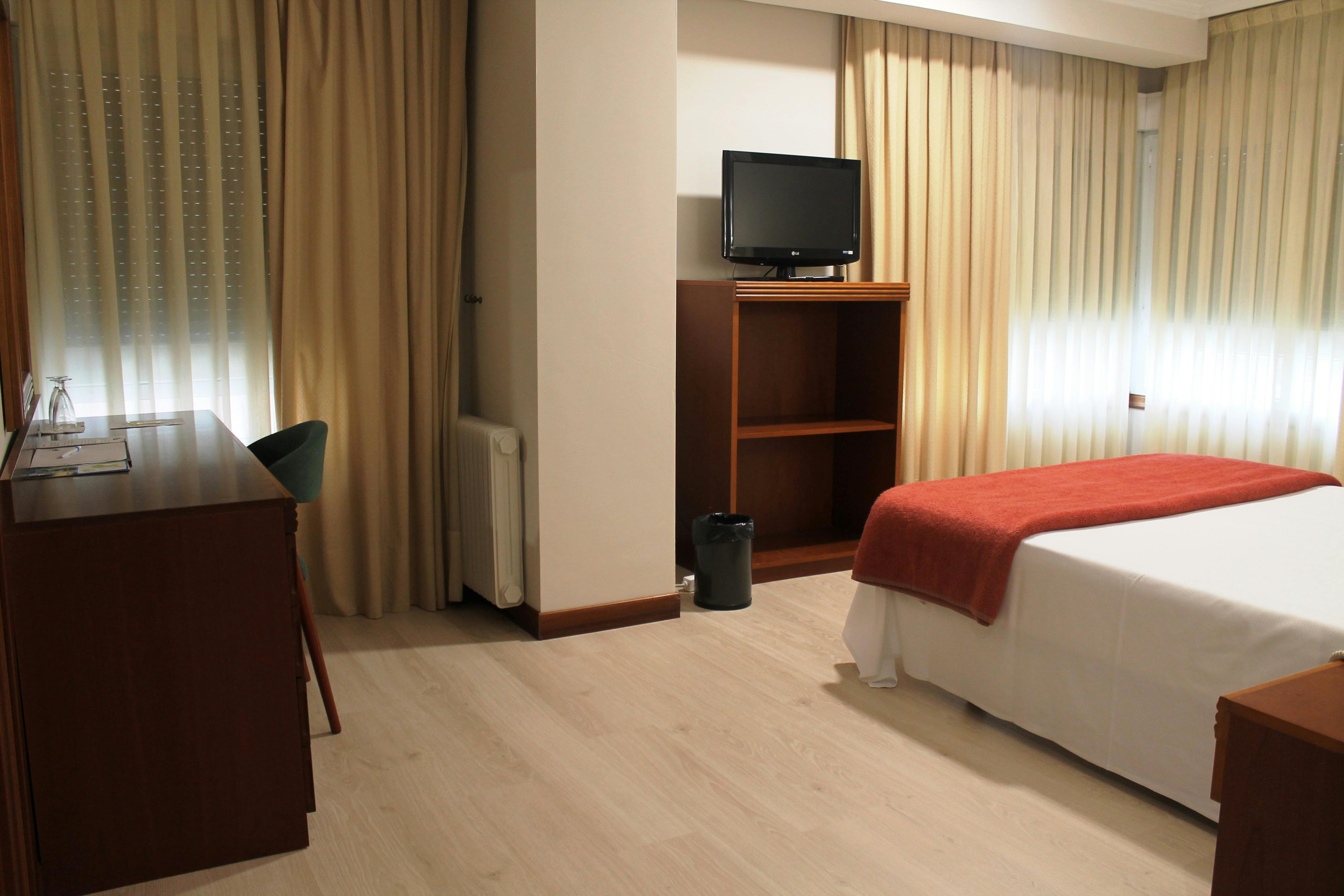 Double room with bathroom (shower or bathtub) (one double bed). Maximum 2 guests. Exterior room. Room equipment: Telephone, air conditioning, desk, heating, wardrobe, hair dryer, free toiletries, wake-up service, flat screen TV. Bed type: 1 bed of 1.50 m.